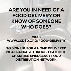 Dear Parish Community – we are so grateful for all your support in this time. We are working hard to make sure everyone in our community is being taken care of. In partnership with Catholic Charities, our parish will be providing food delivery services for those homebound families who are in need of assistance. Our service will be on a first-come first-served basis while we have supplies.